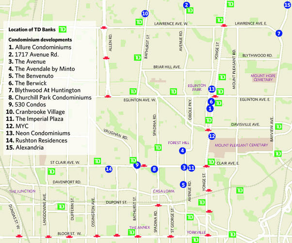 13. NEON CONDOMINIUMS: Yonge St. and Eglinton Ave. Builder: Pemberton Group and Felcorp. Prices: from the $200,000s. Fees: 52 cents sq. ft., plus hydro. Amenities: 24-hour concierge, rooftop terrace with barbecues, party lounge, theatre, fitness and guest suite. Sales: open. Status: over 70 per cent sold. Occupancy: spring 2013. Sales centre: 443 Duplex Ave., 416-987-7878, www.neoncondos.com
