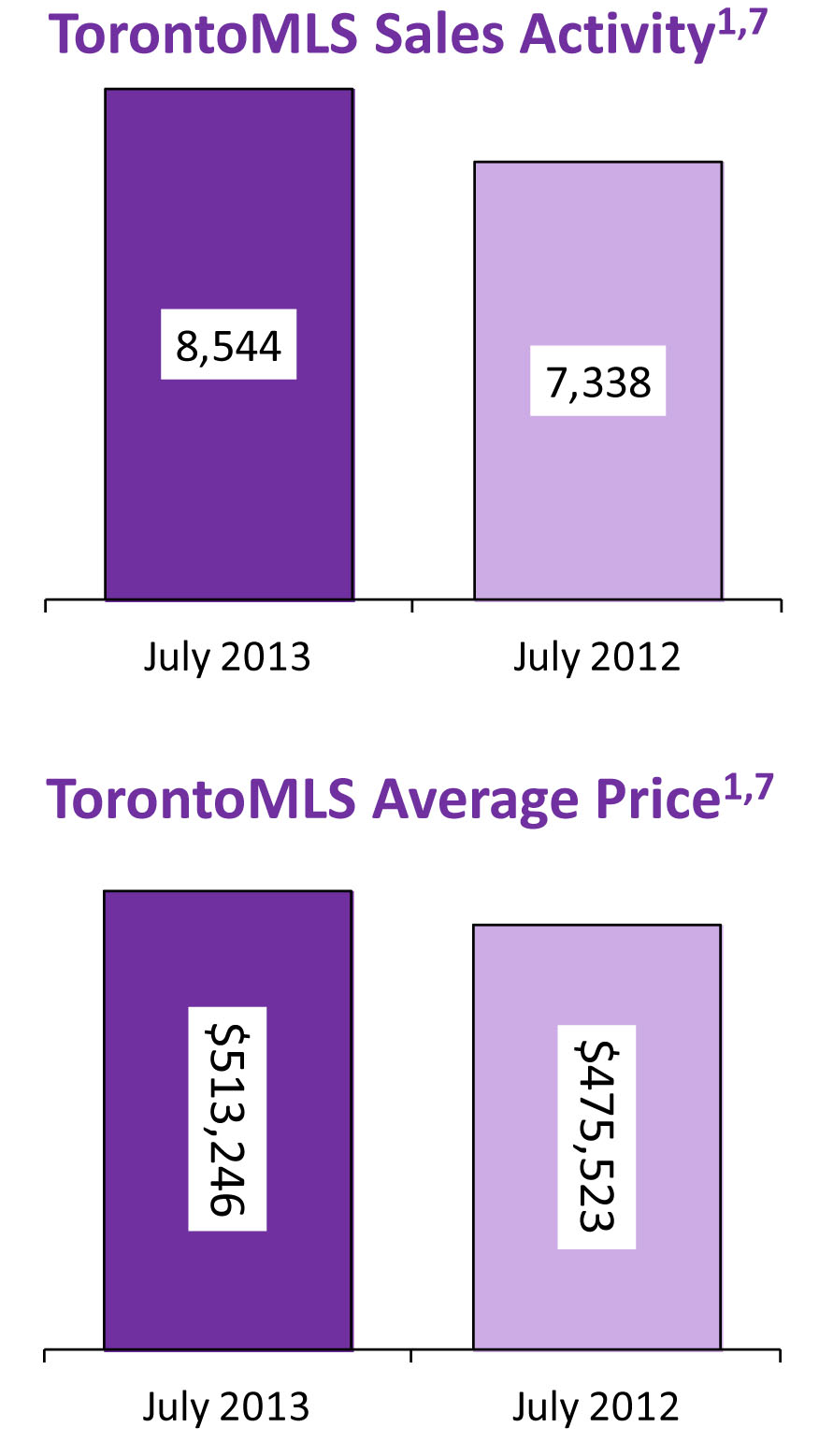 Toronto Real Estate Board reported strong year-over-year growth for July 2014 sales and the average selling price. Sales reported by TREB Members through the TorontoMLS system were up by 10 per cent to 9,198. This was the second-best July sales result on record.The average selling price for July 2014 sales was $550,700 – up by 7.5 per cent compared to